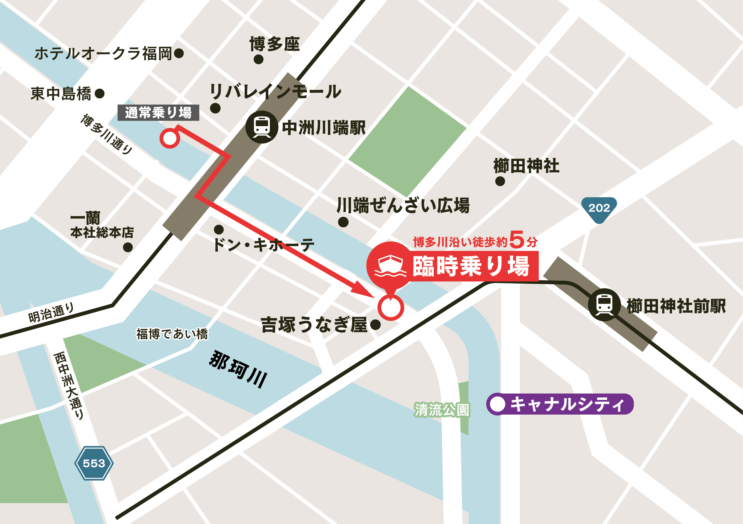 変更内容 通常乗船場(博多リバレインモール前)から、「臨時乗船場(吉塚うなぎ屋前)」へ変更いたします。